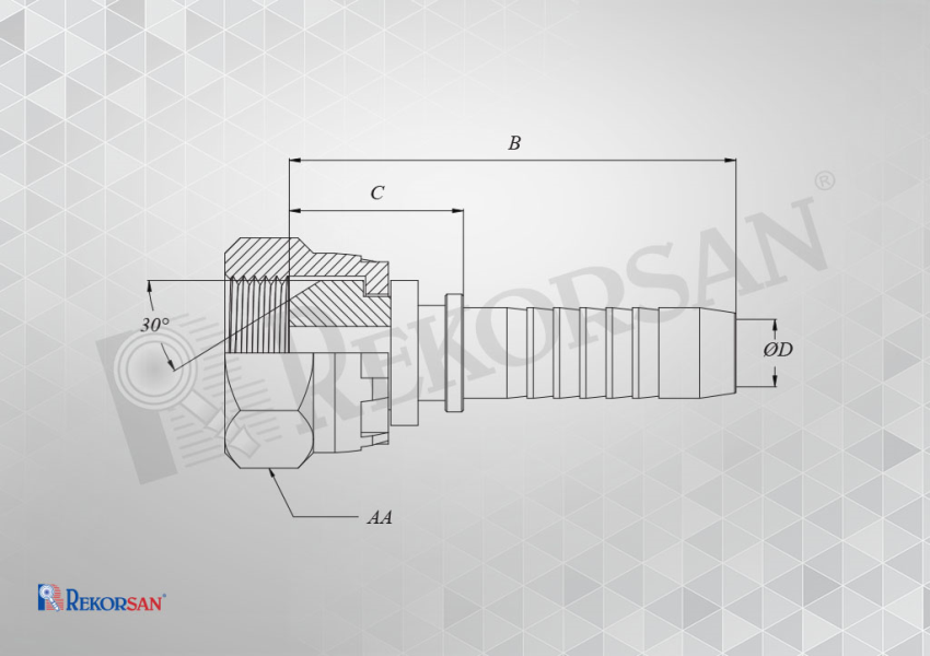 MALZEME KODU MATERIAL CODE | HORTUM ÖLÇÜSÜ HOSE SIZE | SOMUN ÖLÇÜSÜ NUT SIZE | B | C | ØD | AA | |